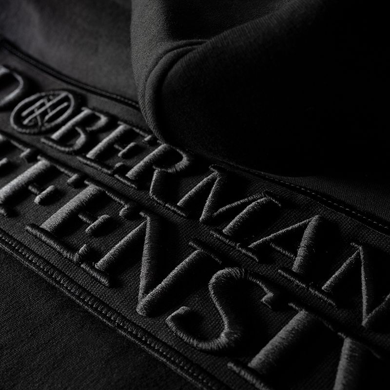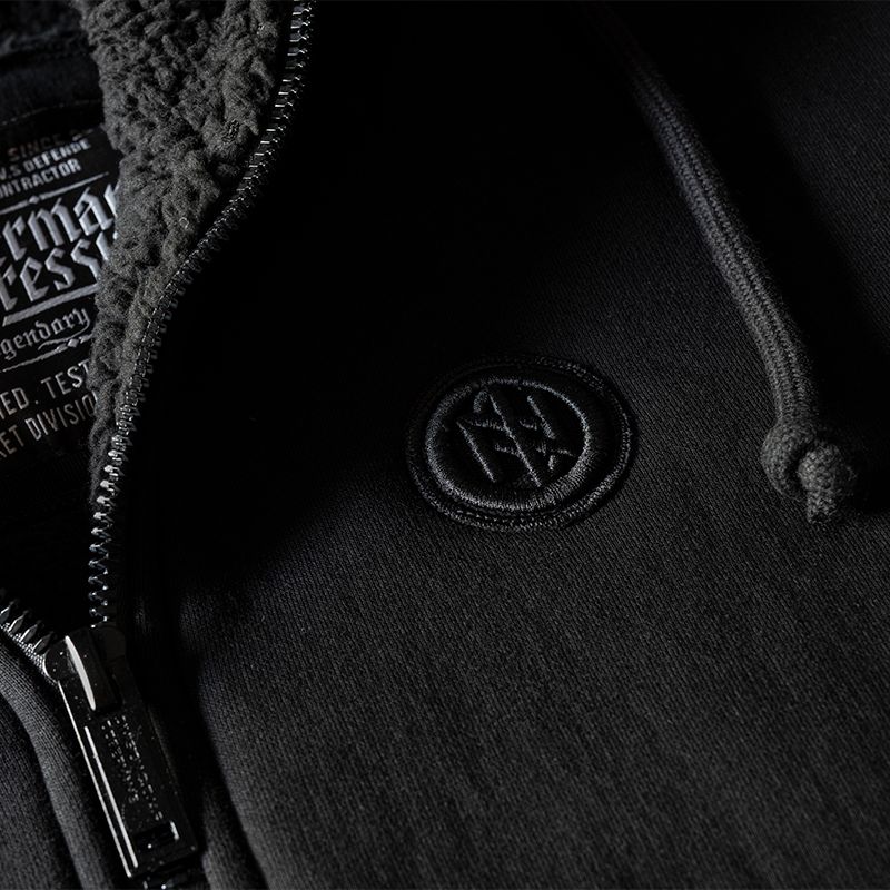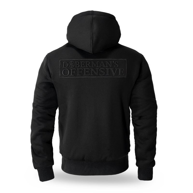 Model na zip s praktickým stojáčkem, který přechází v objemnou kapuci. U kapuce jsou široké šňůrky s kovovými zakončeními, na přední straně jsou našité dvě kapsy. V dolní části je zakončená odolnými stahovacími lemy. Mikina má na zádech černou nášivku s 3D výšivkou „DIVISION Doberman’s Offensive”.
