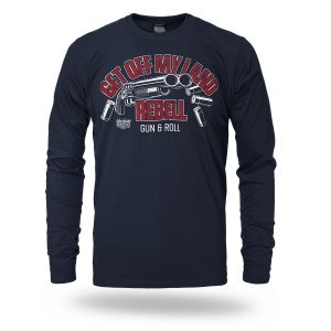 Pánské tričko klasického střihu s dlouhým rukávem ze 100% bavlny. Na hrudníku velký potisk Get Off My Land REBELL Gun & Roll.
