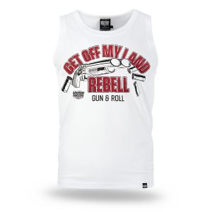 Pánský nátělník. Na přední straně je velký potisk s nápisem Get Off My Land REBELL Gun & Roll.