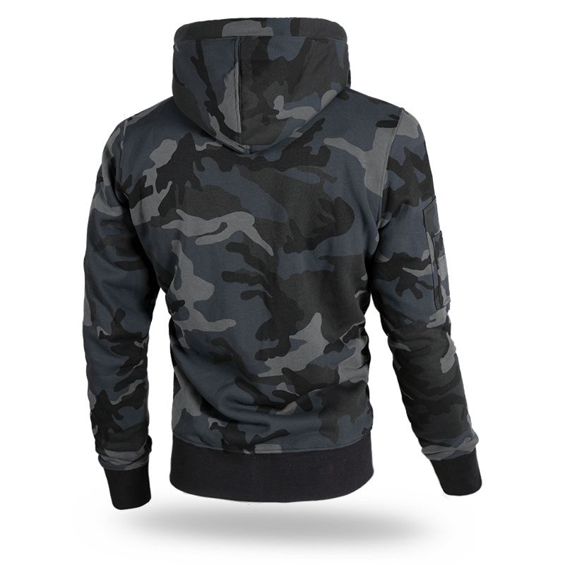 Hoodie with zipper. Made of high quality cotton, it has two pockets on the front, and one on the sleeve. Finished with wide ribs. Hood decorated with a wide drawstring and fittings with the brand logo. Model with woven Doberman’s Aggressive logo patch on chest and shoulder.