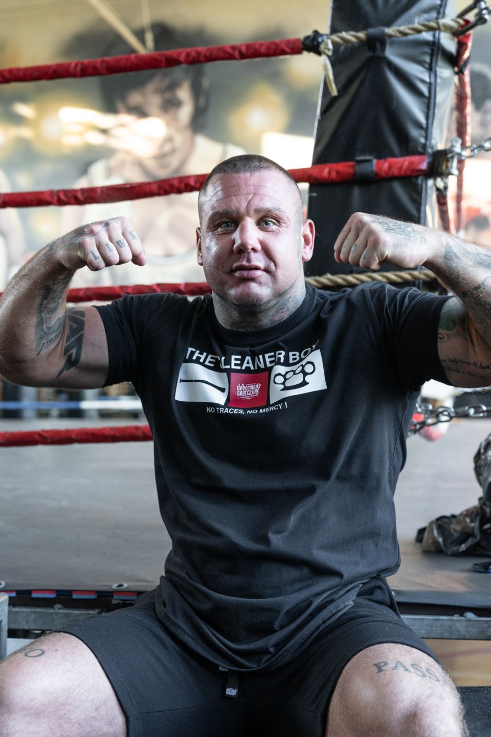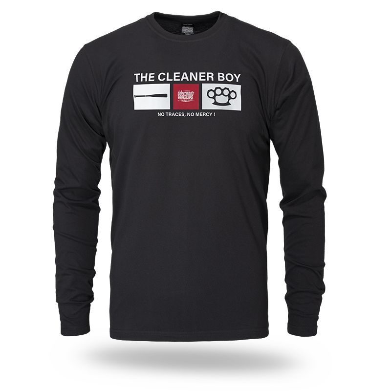 Pánské tričko klasického střihu s dlouhým rukávem ze 100% bavlny. Na hrudníku velký potisk Cleaner boy – No traces,no mercy!