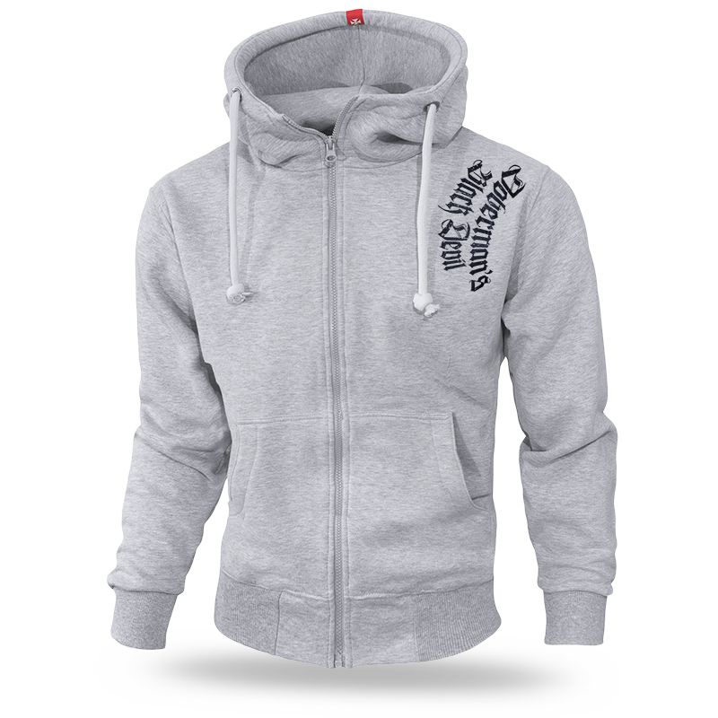 Mikina se zapínáním na zip z vysoce kvalitní bavlny o hmotnosti 320g. Model má hlubokou kapuci s kovovými zakončeními, kterou je možné nastavit pomocí šňůrky. Zvýšený límec skvěle chrání před chladem. Rukávy a dolní část mikiny je zakončená širokým stahovacím lemem. Na levém rukávu je malá cedulka s logem firmy. Nápis Dobermans Black Devil je vytištěný na levém rameni na přední straně mikiny. Zadní část zabírá vzor se dvěma dobrmany v náhubcích. V zadní části je runový znak. Výše je velký nápis, který přechází přes oba švy rukávů. Vzor z řady Dobermans Black Devil.