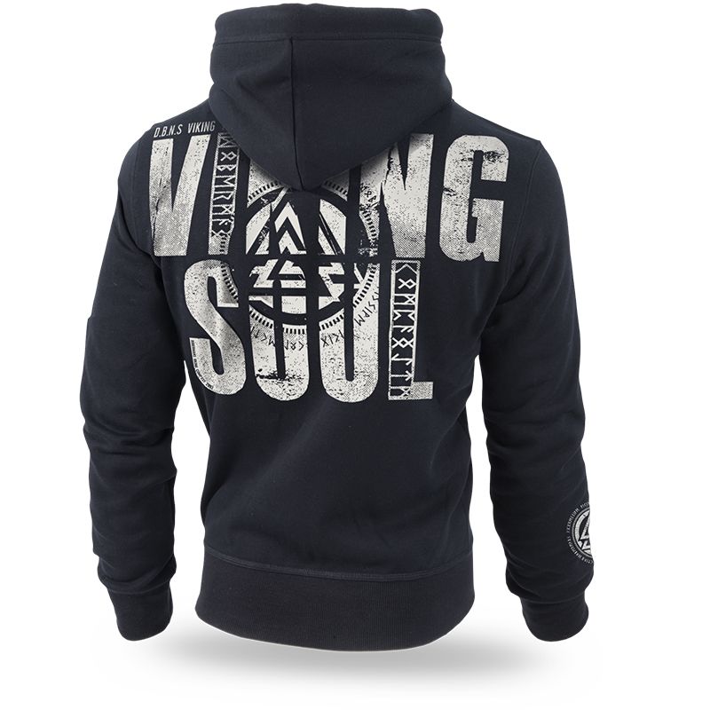 Pánská mikina vyrobená z bavlny. Model má dvě velké kapsy a zip na přední straně. Vysoký límec přechází v kapuci, kterou je možné nastavit šňůrkami. Dolní část je zakončená širokým stahovacím lemem. Dolní část pravého rukávu je ozdobená potiskem kruhu s runovými symboly. Na zádech se nachází velký potisk s nápisem Viking Soul. V nápisu jsou vyřezané tvary, které navazují na severskou mytologii. Na levé straně hrudi je menší potisk s názvem modelu. Vzory s efektem poničení.
