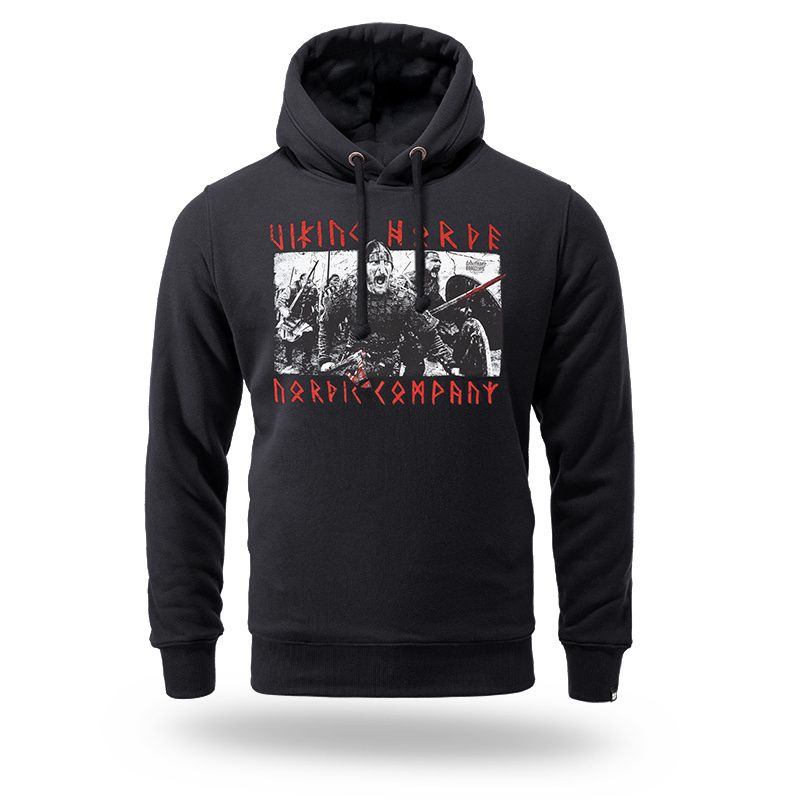 Mikina s kapucí od Dobermans Aggressive je vyrobena z příjemné, pohodlné bavlny,zakončena širokými, elastickými stahovacími lemy jak v pase, tak i na rukávech. Na dvojitě prošité kapuci je velké logo Doberman’s Aggresive. Na přední straně trička se nachází vzor, který zobrazuje útočící Vikingy s nápisem VIKING HORDE. Na zadní straně text v runových symbolech.