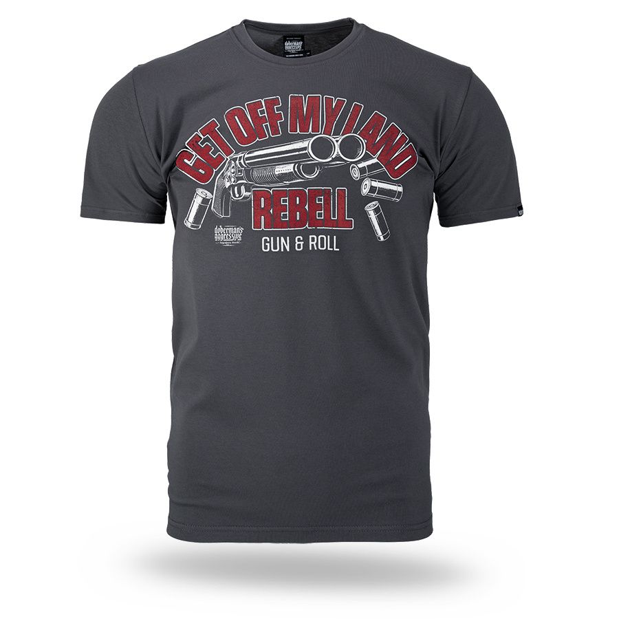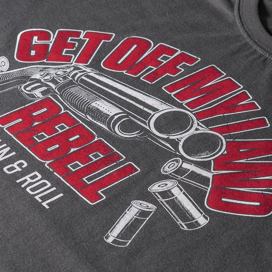 Pánské tričko ze 100% bavlny klasického střihu s krátkým rukávem. Na levém rukávu je umístěna malá cedulka s logem značky. Na hrudníku velký potisk Get Off My Land REBELL Gun & Roll.