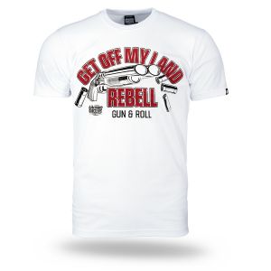 Pánské tričko ze 100% bavlny klasického střihu s krátkým rukávem. Na levém rukávu je umístěna malá cedulka s logem značky. Na hrudníku velký potisk Get Off My Land REBELL Gun & Roll.