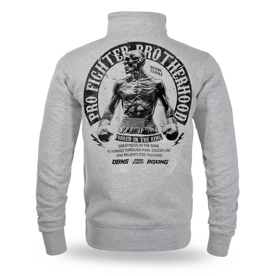 Mikina na zip se stahovacími lemy se dvěma kapsami na přední straně ze 100% bavlny. Vpředu a vzadu potisk Pro Fighter Brotherhood – Forged in the Ring.
