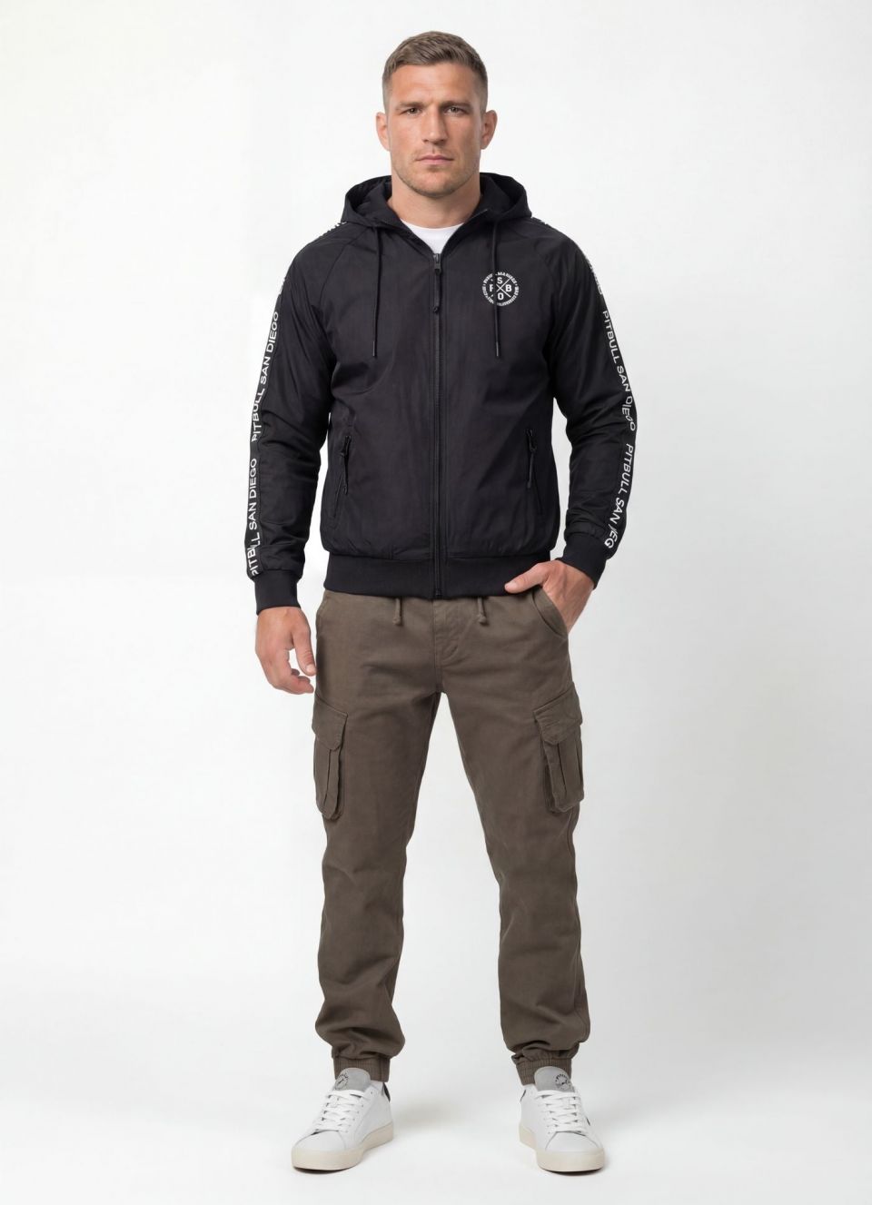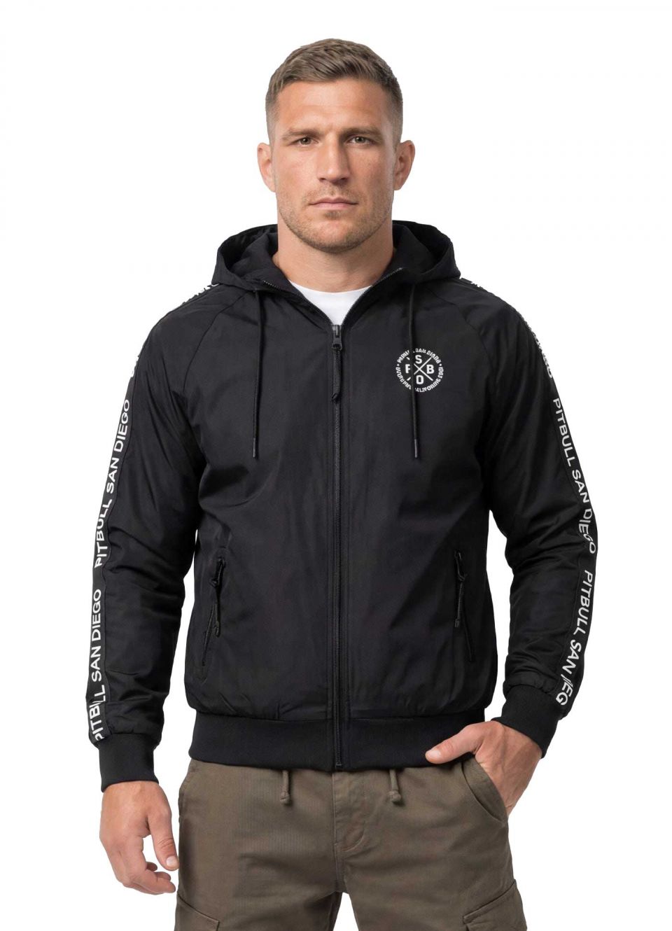 - Žakárové pruhy s nápisem "PITBULL SAN DIEGO" po celé délce rukávů