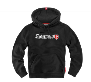 Men's pouch pocket sweatshirt. The chest with a one-color print with the collection name and the "D.A. Combat Gear 44" sign and the three-colored embroidered patch in the form of a shield with a cross in the Scandinavian style. On the back there is a large "Doberman's" logo printed vertically along the spine. Sweatshirt made of pure cotton with a weight of 320g. Pouch pocket sweatshirt model. It has a hood with strings and wide cuffs. Red inserts with the brand logo visible by the hood and side of the sweatshirt.