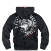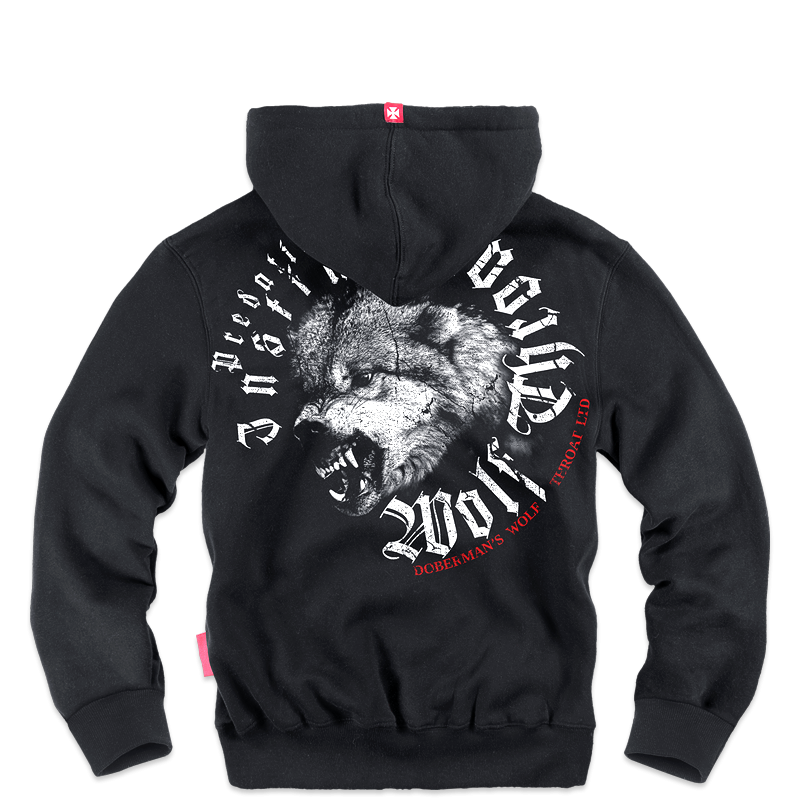 Zipped sweatshirt with one-color graphics on the back. Pattern with a wolf's head and the name of the line. Next to it there is a semi-circular “Predative Instinct” inscription, duplicated in a smaller size on the front of the product. The gothic font and cracked printing effect were used. Sweatshirt made of 320g weight cotton. Classic men's model finished with durable cuffs. It has patch pockets and a high collar by the hood. Inner red pleat and a large tag with the eagle theme.