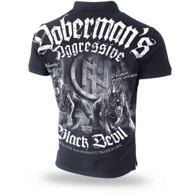 Men’s polo shirt from the Dobermans Black Devil line. It has short sleeves and a collar with three buttons. On the sleeve, there is a black label with the Dobermans Aggressive logo. Made of high-quality cotton (200g). Near the left shoulder, there is a mono-chromatic imprint with a damage-like effect. The imprint on the back covers almost the entire surface. The mono-chromatic graphic presents two Dobermans in muzzles under a large inscription reading Dobermans Aggressive.