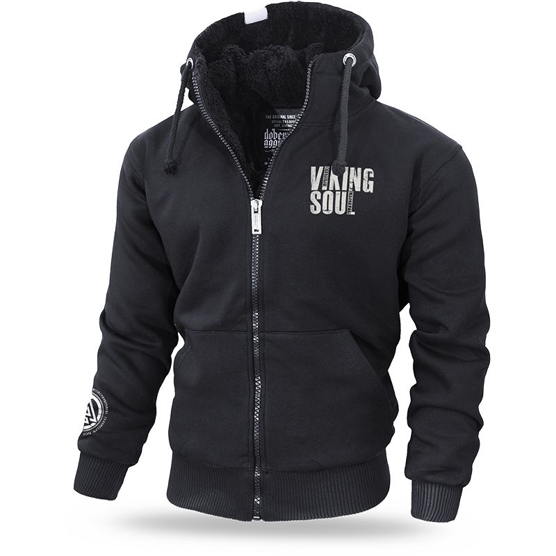A sweatshirt with an additional sheepskin layer which perfectly protects against low temperatures. On the front, there is a zipper and two pockets. The raised collar continues into a hood which can be adjusted with drawstrings. It is made of high-quality cotton. On the back, there is a large imprint reading “Viking Soul”. Inside the inscription, there are cut-out symbols referring to the Nordic religion. On the right sleeve, there are runic symbols inscribed into a circle. The left breast is decorated with a repeated name of the model in a smaller size.