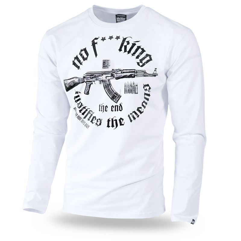 Classic men's long sleeve shirt. Made of 200g cotton. At the neck finished with a small welt that improves comfort. Label with the Dobermans Aggressive logo sewn on the left sleeve. large circle-shaped print on the chest. In the central part of the graphics there is a shotgun in the company of cartridges, which surrounds the inscription made with a characteristic, Gothic font.