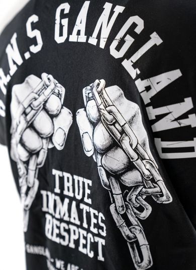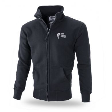 Classic zipped sweatshirt and stand-up collar. Made of high-quality cotton, finished with wide welts, with two pockets in front. On left sleeve small design with brand’s logo. Gangland model with characteristic overprint at the back showing clenched fight fists with chains. Fists design with original inscriptions typical for Doberman’s. Plain front with fist minature on the left side of chest.