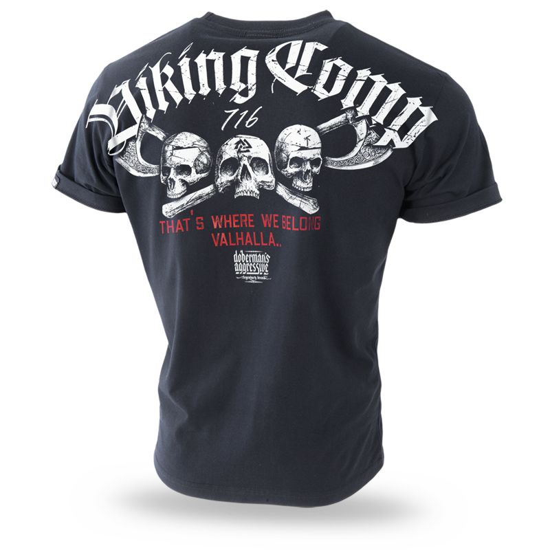 Men's t-shirt in a standard cut. Made of cotton of very high weight . Small label with brand logo sewn on the left sleeve. On the back is a two-tone graphic with Viking Comp lettering, three skulls and axes, and the words "That's where we belong Valhalla. " On the front left chest, a thumbnail image of the graphic found on the back of the T-shirt.