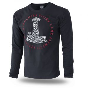 Men's t-shirt in a classic cut with long sleeves and a round collar. Made of the highest quality cotton. Left sleeve with small Doberman's Aggressive label sewn on. On the front, a graphic of Thor's hammer and the brand's logo. Red runic symbols around the graphic. On the back at the neck, a miniature graphic of Thor's hammer.
