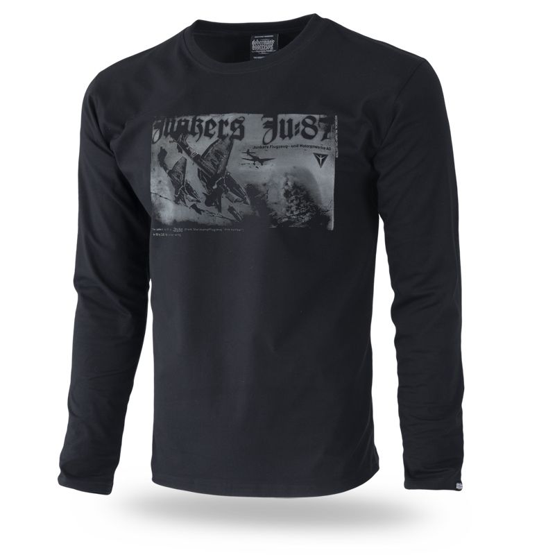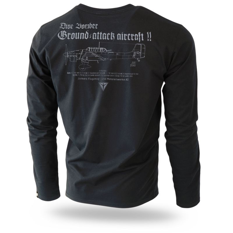 A classic men's long sleeve shirt with an elastic welt at the neck and a reinforcing pleat along the back of the neck. Made of heavyweight cotton. Graphics on the front depict WWII’s Ju87 bombers. At the top of the graphic are words Junkers Ju87 in a gothic typeface. On the back, a diagram of the plane with a description of the armament.