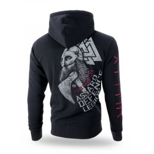 Hooded jumper with zipper. It is made of high quality cotton and has two pockets on the front, which are studded with ribbed cuffs. On the left sleeve a small brand logo tag. The hood is decorated with a thick cord and fittings with the brand logo On the back there is a graphic showing a Nordmann with an axe. On the front of the left chest is a miniature of the Nordic symbol with the inscription Asgard Defence Legion.