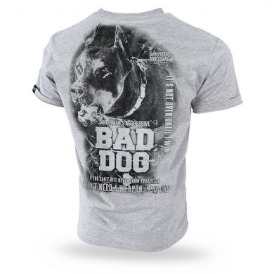 Men's T-shirt with short sleeves in a classic style. Made of high weight cotton. A small label with the brand logo is sewn on the left sleeve. The Bad Dog model depicts a rabid Doberman, with a large inscription "Bad Dog" below. On the front of the T-shirt the inscription "Bad Dog" and the brand logo.