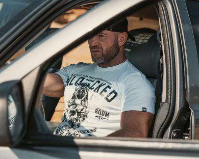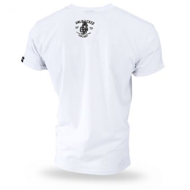 Men's T-shirt with short sleeves in a classic style. A small label with the brand logo is sewn on the left sleeve. Model of T-shirt with distinctive graphics, skull in navy blue and inscription “Unlocked Explode!” and Doberman’s logo. On the neck duplication of graphics in a smaller format.