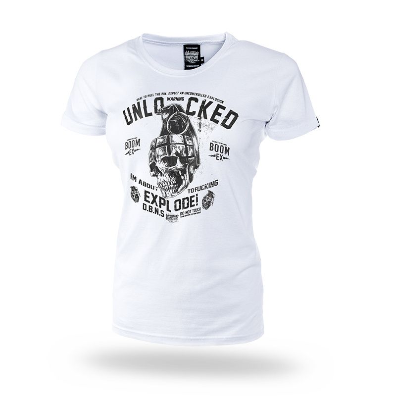 Women's T-shirt in a simple cut.On the left sleeve small label with brand logo. Model of T-shirt with distinctive graphics, skull in navy blue and inscription “Unlocked Explode!” and Doberman’s logo. On the neck duplication of graphics in a smaller format.