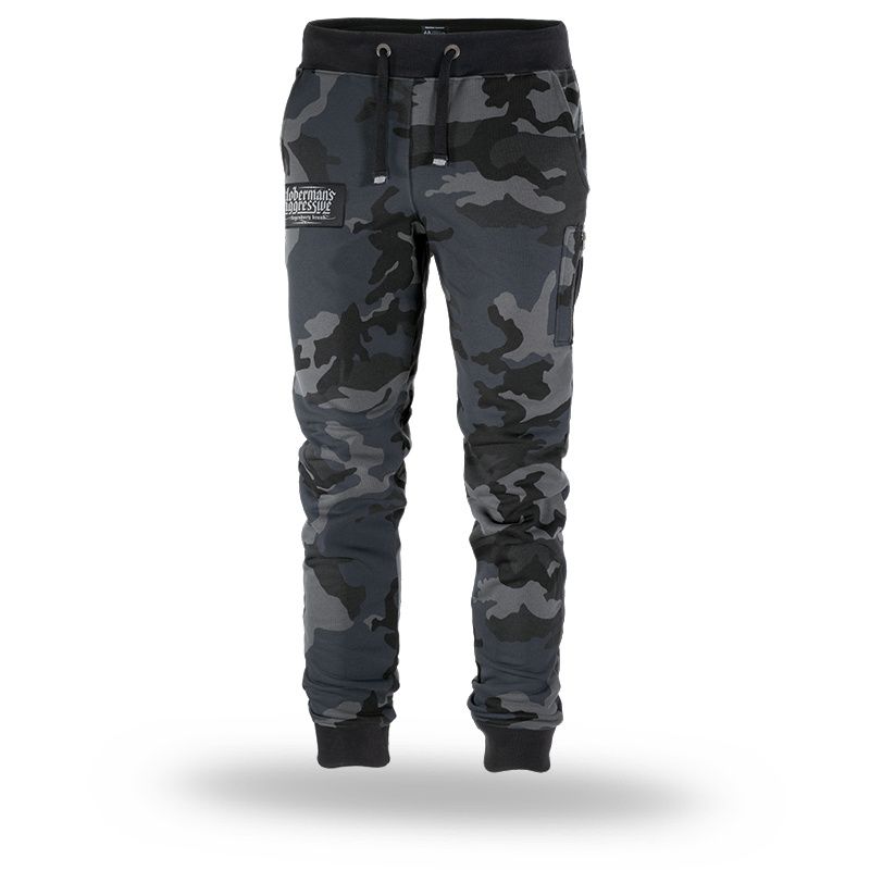 Men's sweatpants made of thickly woven cotton with two side pockets and a pocket at the back of the pants.Model with a woven patch with the Doberman's Aggressive.