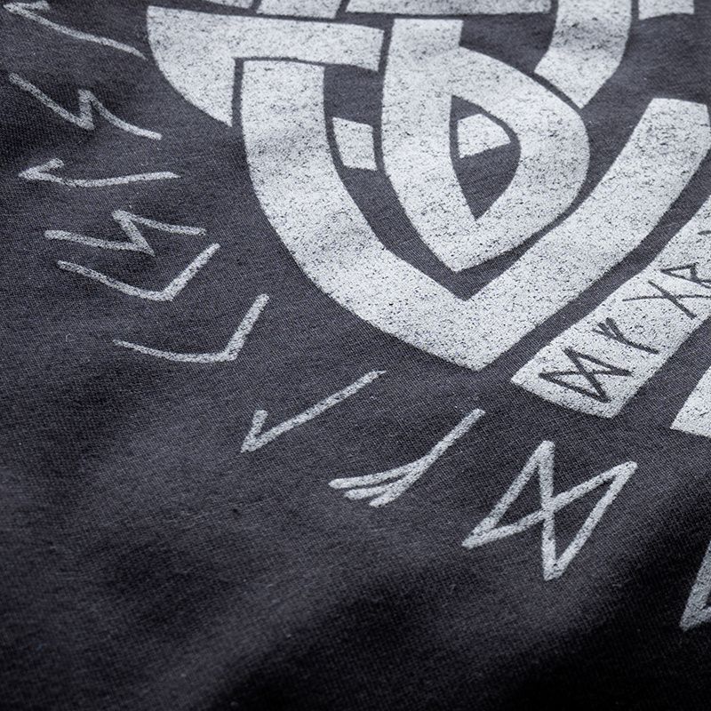 Classic men's t-shirt with long sleeves, elastic waistband at the neck. Made of high-weight cotton. A small label with the brand logo is sewn on the left sleeve. On the front of the shirt is a small embroidered patch with a Nordic symbol. The back of the T-shirt is decorated with a large Nordic-style graphic made by convex printing method.