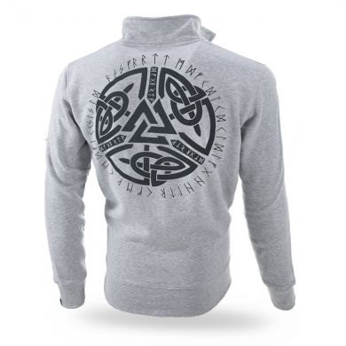 Model sweatshirt with zipper and high collar. Two pockets on the front, on the left sleeve small label with Dobermans Aggressive logo. Bottom sweatshirt and sleeves finished with strong drawstrings. The sweatshirt is made of high quality cotton. On the front of the sweatshirt there is a small embroidered patch with a Nordic symbol. The back of the sweatshirt is decorated with a large Nordic-style graphic made by convex printing.