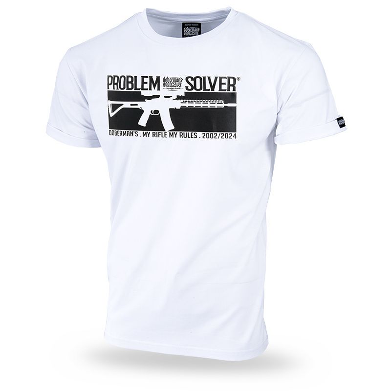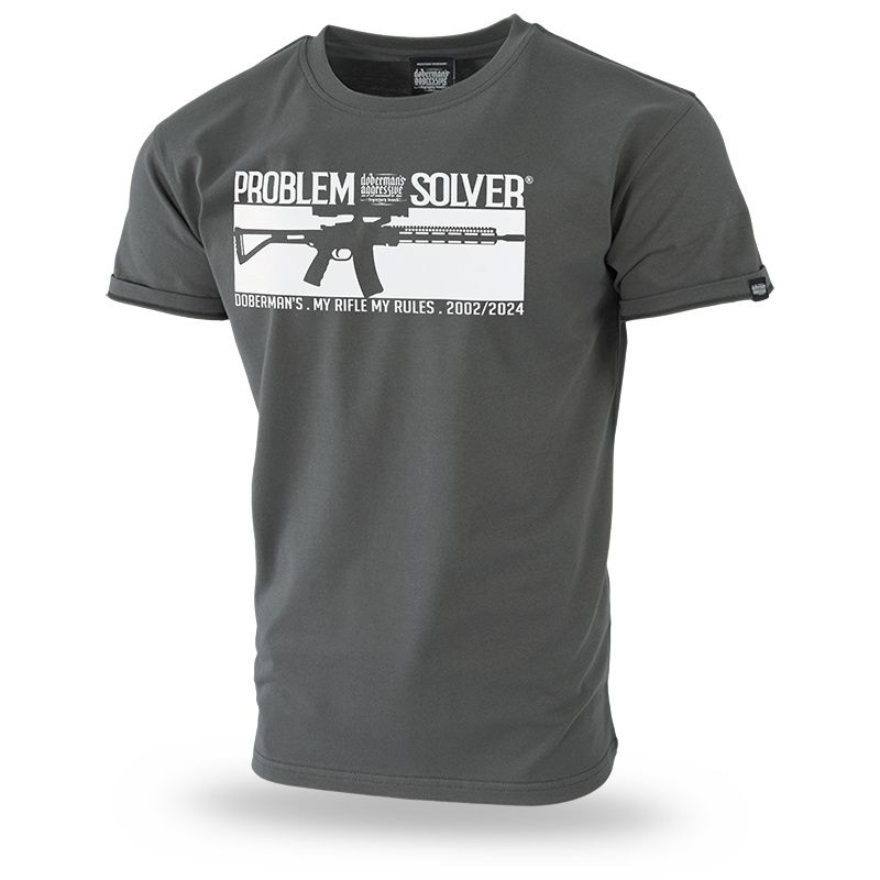 Men's T-shirt with short sleeves in a classic style. Clothes made of cotton with a weight of 200g. On the left sleeve a small label with the Doberman’s Aggressive logo. On the front of the shirt is a machine gun graphic, additionally the inscription PROBLEM SOLVER.