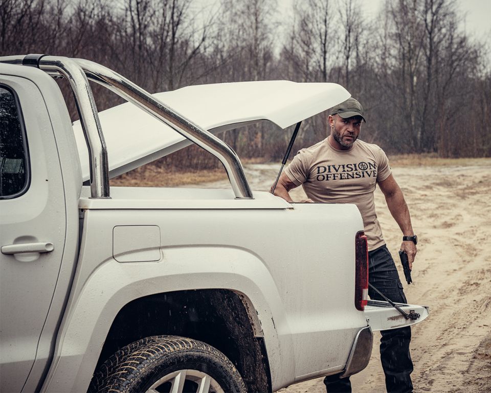 Men's T-shirt with short sleeves in a classic style. Clothes made of cotton with a weight of 200g. On the left sleeve a small label with the Doberman’s Aggressive logo. On the front of the T-shirt is the inscription Division Offensive made in convex print. The pattern is complemented by the Nordic symbol.