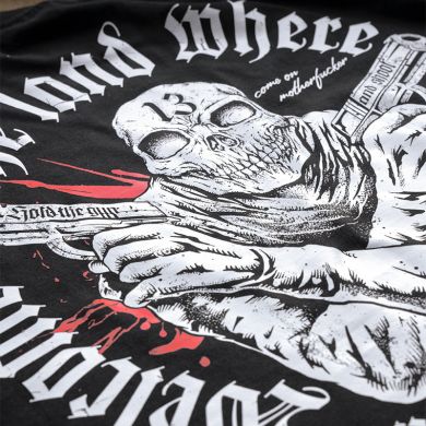 Made of high-weight cotton. A small label with the brand logo is sewn on the left sleeve. On the back a large print depicting a figure with a skull head holding two pistols. "Welcome to the land where strangers die". On the chest similar graphics in a smaller size.