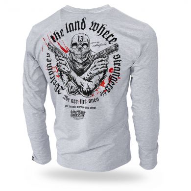 Made of high-weight cotton. A small label with the brand logo is sewn on the left sleeve. On the back a large print depicting a figure with a skull head holding two pistols. "Welcome to the land where strangers die". On the chest similar graphics in a smaller size.