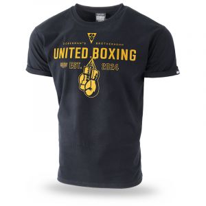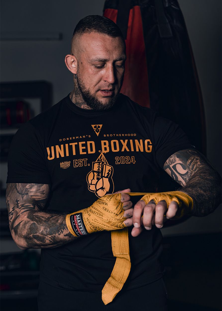 Men's T-shirt with short sleeves in a classic style. Clothes made of cotton with a weight of 200g. On the left sleeve a small label with the Doberman’s Aggressive logo. On the front of the shirt is the inscription UNITED BOXING combined with the graphics of boxing gloves. The whole is complemented by additional smaller graphic elements.