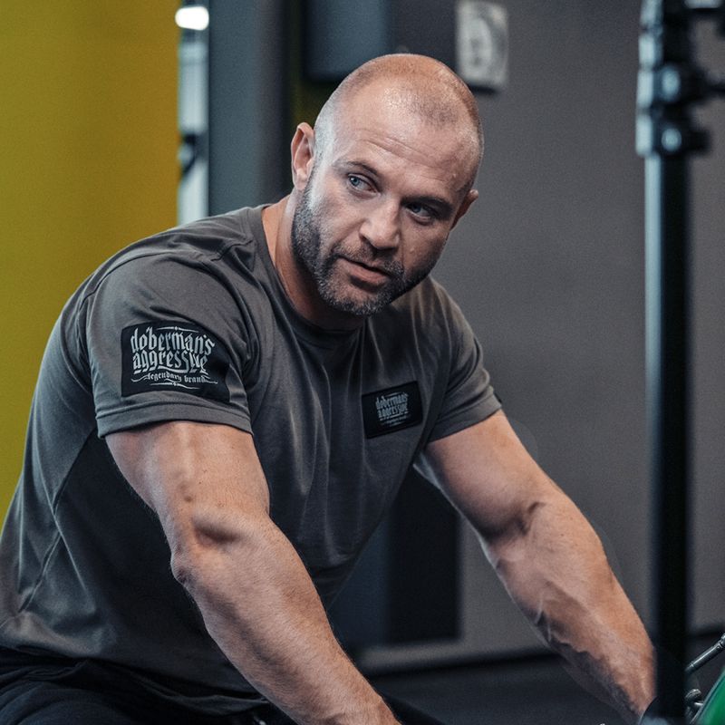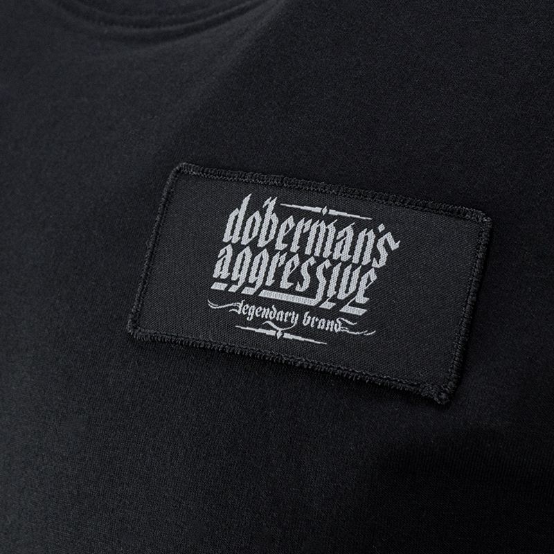 Men's standard cut T-shirt, made of high quality cotton. Black Doberman's Aggressive patch on the left chest. There is a sewn-in tag with the brand logo on the sleeve.