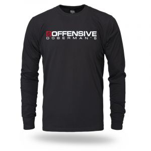 Made of high weight cotton. On the left sleeve all small label with the brand logo. On the front of the shirt is a simple inscription OFFENSIVE with a letter underneath it DOBERMANS. The whole design complements the Nordic symbol inscribed in the shape of a square.