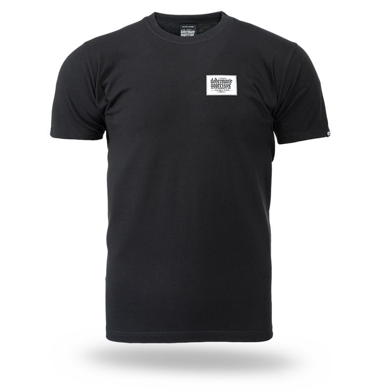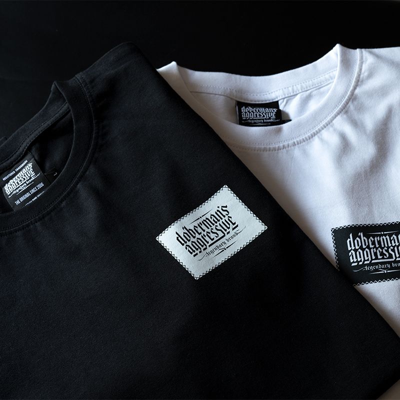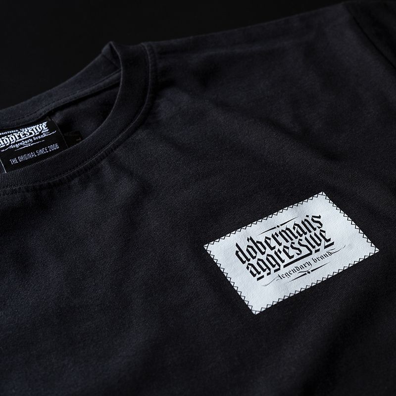 Clothing made of cotton with a weight of 200g. On the left sleeve is a small label with the logo Doberman’s Aggressive. On the front of the shirt on the left chest there is the brand logo made as an imitation of the patch sewn with a thin thread. The whole gives a very interesting effect.
