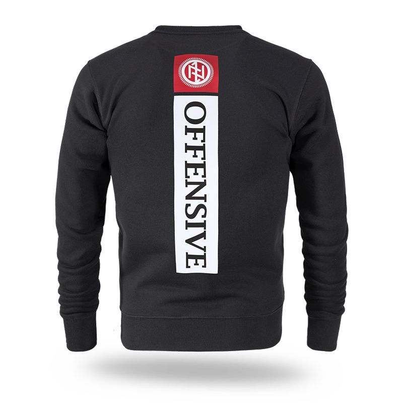 Men's classic sweatshirt worn by the head. Made of high quality cotton with a weight of 320g. A small label with the brand logo is sewn on the left sleeve. The bottom of the sweatshirt and sleeves finished with a wide drawstring. A vertical print with the "OFFENSIVE" slogan on the back, with a small brand logo above it. A minimalist detail in the form of a small logo on the chest.