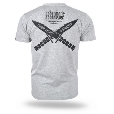 Men's T-shirt with short sleeves in a classic style. Clothes made of cotton with a weight of 200g. On the left sleeve a small label with the Doberman’s Aggressive logo. The back features a large 3D puff print depicting crossed tactical knives with their blades pointing upward, along with the inscription "COMBAT TACTICS & STRATEGY". The front is plain, without a print.