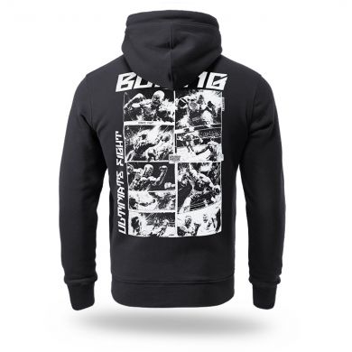 Hooded kangaroo sweatshirt, made of high-weight cotton. The bottom of the sweatshirt and sleeves are finished with a wide drawstring. On the left sleeve there is a small label with the brand logo.