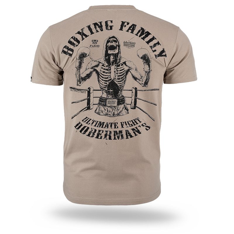 Men's T-shirt with short sleeves in a classic style. Clothes made of cotton with a weight of 200g. On the left sleeve a small label with the Doberman’s Aggressive logo. The back features a large print depicting a skeleton boxer in the ring along with the slogans "BOXING FAMILY," "ULTIMATE FIGHT," and "DOBERMAN'S." The front is adorned with a small chest print featuring a graphic and the inscription "BOXING FAMILY."