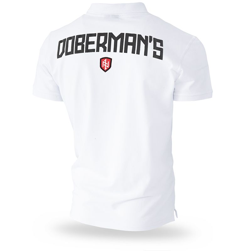 Men’s polo shirt with short sleeves made of high-quality cotton. There is a label on which the brand logo is located. On the front is the large convex inscription DOBERMAN’S, with an embroidered patch of the dial with the rune sign, located below the inscription. At the neck there is the same patch in a smaller size.