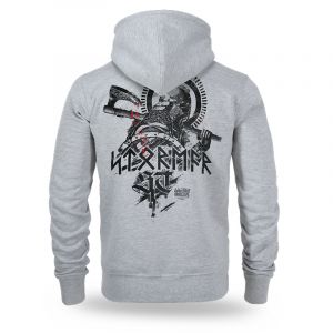 Men's hoodie with zipper.On the left sleeve small label with brand logo. Hood decorated with a thick drawstring and fittings with the brand logo. The model stands out with an impressive back print featuring a Norse warrior in a helmet, holding a shield and an axe. The design is completed with a large “STORMER” inscription styled in runic alphabet, which also appears on the front chest.