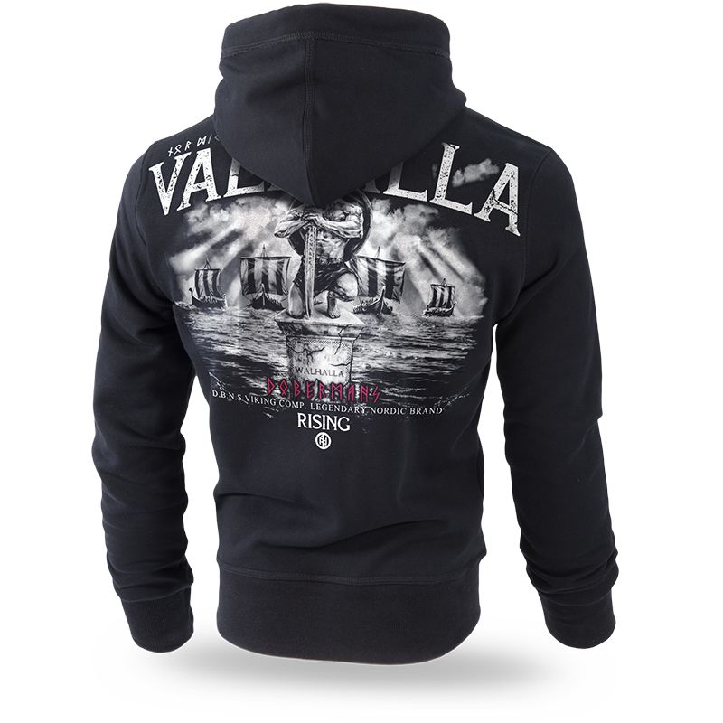 A slip-on sweatshirt made of high-quality 320g cotton. It is a model with wide ribbing at the bottom and a large hood that can be easily adjusted with drawstrings. The left sleeve features a small label with a “Dobermans Aggressive” inscription. A pouch pocket on the front, the left breast features a small imprint with an inscription of “Valhalla” and a runic symbol. The back part is almost completely covered with an imprint, a graphic with a brave warrior in elevation. The Viking is leaning over a sword and has a shield on his shoulders. Behind him, there is a fleet of Viking ships on the sea. The pattern refers to the Scandinavian culture.