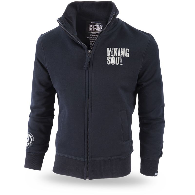 A classic sweatshirt with a zipper and two pockets on the front. The bottom and sleeves are finished with ribbing. Inside, there is a large label with the Dobermans Aggressive logo. The model is made of high-quality material. On the right sleeve, there are ornaments related to the Nordic mythology. The back is covered with a large imprint reading “Viking Soul”. In the center of the inscription, there are runic symbols. The left breast is decorated with the same inscription in a smaller size. A model from the Vikings collection.