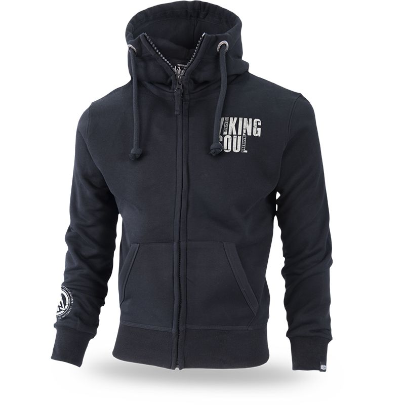 A cotton men’s hoodie with two large pockets and a zipper on the front. The high collar continues into a hood which can be adjusted with drawstrings. The bottom part is finished with wide ribbing. The bottom of the right sleeve is decorated with an imprint of a circle with runic symbols. On the back, there is a large imprint reading “Viking Soul”. The inscription features cut-out shapes referring to the Nordic mythology. On the left breast, there is a smaller imprint with the name of the model. The imprints use the damage-like effect.