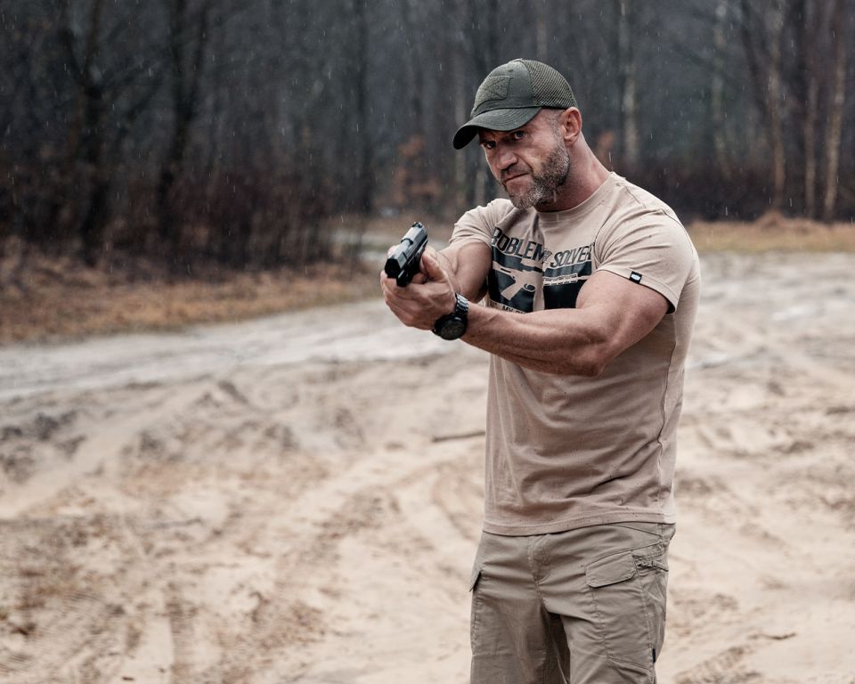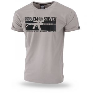 Men's T-shirt with short sleeves in a classic style. Clothes made of cotton with a weight of 200g. On the left sleeve a small label with the Doberman’s Aggressive logo. On the front of the shirt is a machine gun graphic, additionally the inscription PROBLEM SOLVER.