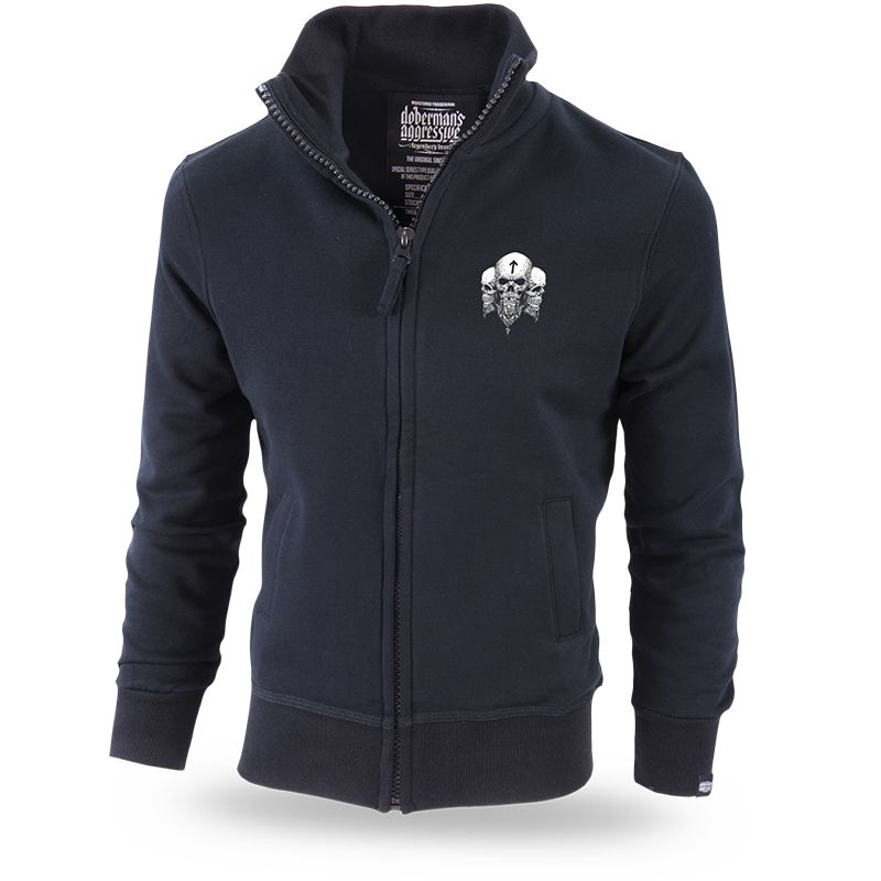 A classic-cut zipped model with wide ribbing at the bottom of the sweatshirt and its sleeves. It has two pockets on the front part. Inside, there is a large label with the Dobermans Aggressive logo. Three small skulls are printed on the front part of the sweatshirt. The back part is covered with a pattern featuring a Viking skull, with two embellished axes behind it. The whole pattern is enclosed with two banners reading “Viking Horde” and “Brotherhood”. The graphic design refers to the Nordic mythology; the Vikings collection.