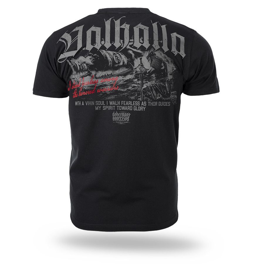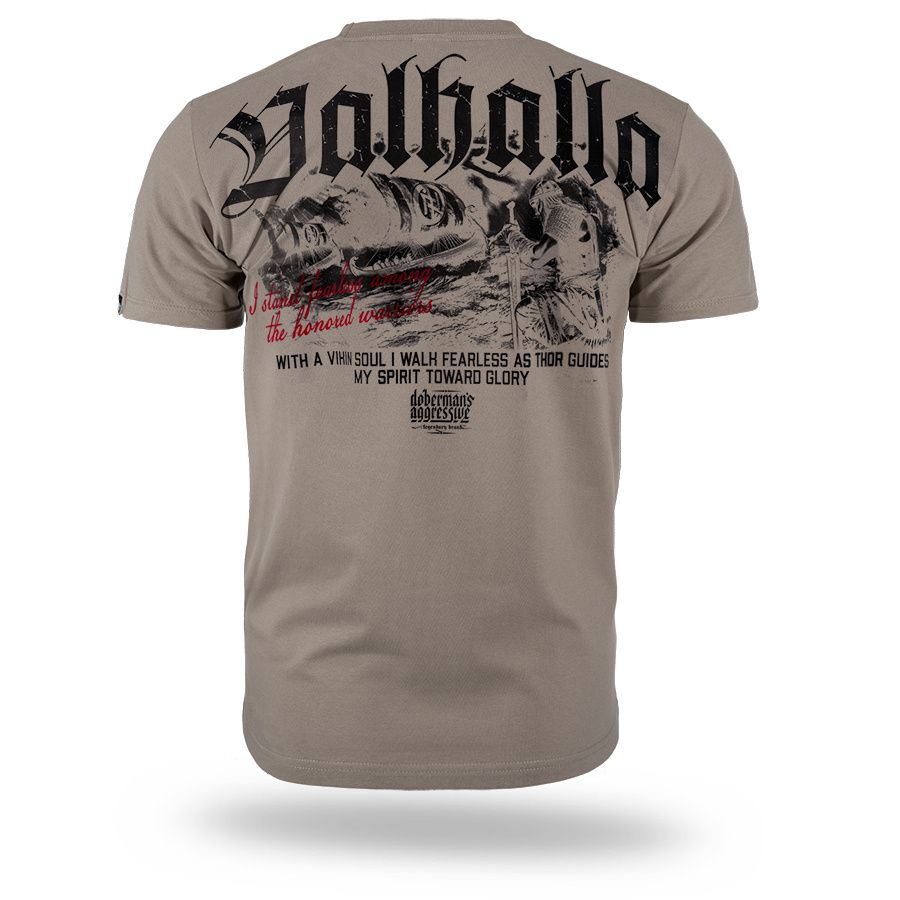 Model with a round neckline finished with a ribbed trim, ensuring comfortable fit and freedom of movement. On the left chest, there is a small “Valhalla” logo with a graphic symbol. The back features a large, striking print inspired by Norse mythology – depicting a warrior motif and bold “Valhalla” typography. The design is completed with slogans referring to courage, honor, and battle, emphasizing the raw, warrior character of the collection.