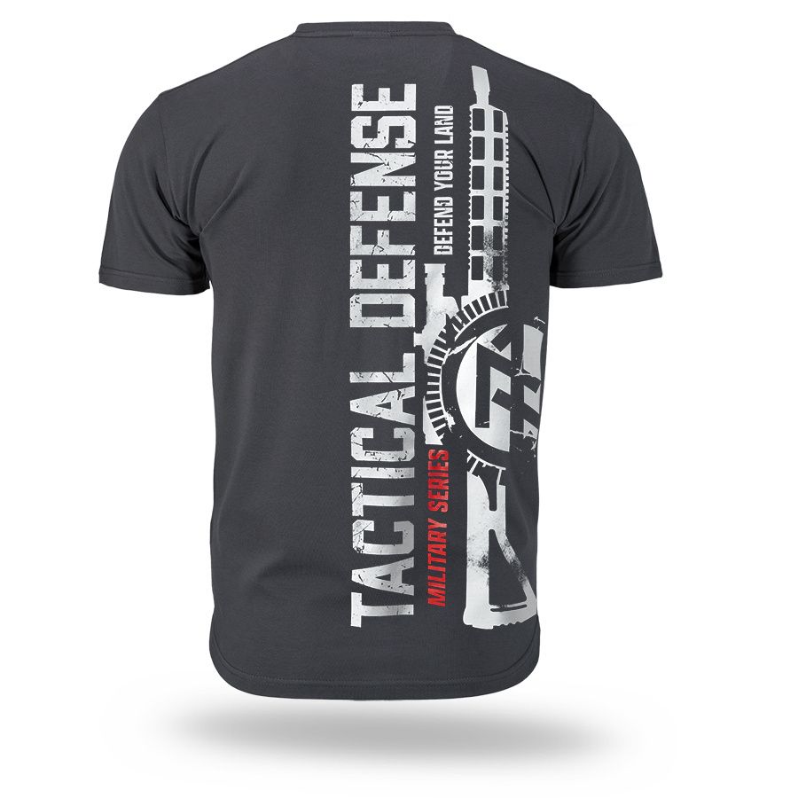 Made of high-quality cotton ensuring all-day comfort and good breathability. The front features a subtle print with a skull and crossed weapons motif along with the “Tactical Defense” lettering. The back draws attention with a large, dynamic graphic featuring a rifle, technical elements, and the vertical text “Tactical Defense – Military Series – Defend Your Land.” The overall design reflects a strong, military-inspired style, perfect for those who appreciate bold graphics and a distinctive character.
