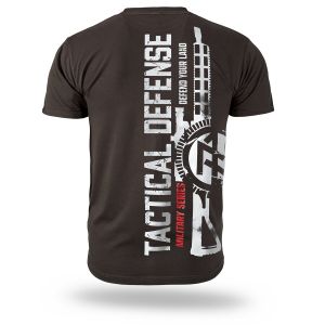 Made of high-quality cotton ensuring all-day comfort and good breathability. The front features a subtle print with a skull and crossed weapons motif along with the “Tactical Defense” lettering. The back draws attention with a large, dynamic graphic featuring a rifle, technical elements, and the vertical text “Tactical Defense – Military Series – Defend Your Land.” The overall design reflects a strong, military-inspired style, perfect for those who appreciate bold graphics and a distinctive character.